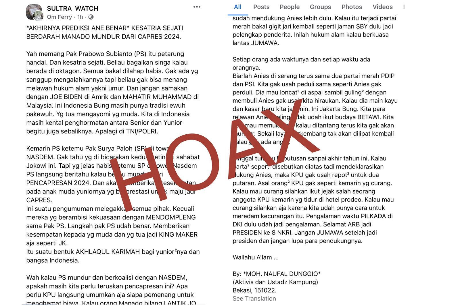 JPNN.com, JAKARTA – Sebuah pesan berantai yang menyebutkan Prabowo Subianto mundur dari pencalonan sebagai presiden 2024 telah beredar di dunia maya. Kabar kebohongan ini beredar di beberapa sosial media, YouTube, Facebook, dan WhatsApp.